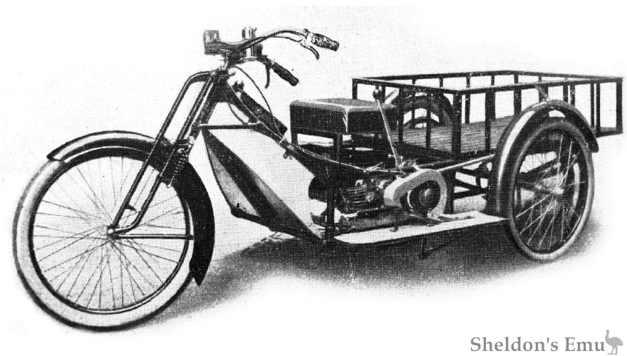 The first model was a motor-dreirad with an air-cooled 133cc Rinne engine and Sturmey-Archer gearbox driving by belt to to the left rear wheel. It was eligible for the tax-free bracket.