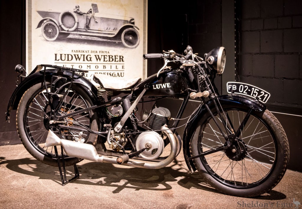 Early Luwe machines used 148cc and 198cc ohv Paqué engines. Later motorcycles used Kühne 348cc ohv units, 750cc V-twin engines from MAG in Switzerland, and others from English suppliers JAP and Blackburne.
