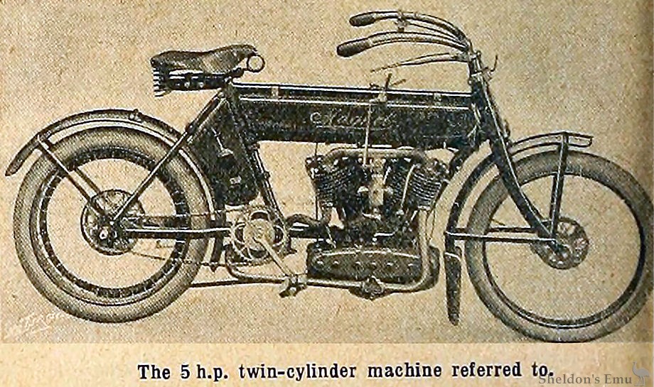 The second model is a twin-cylinder 5 h.p. mount, cylinder dimensions 70 mm. by 82 mm. The inlet valves are mechanically operated on the machine by means of overhead tappet rods. Another interesting point is that two magnetos are fitted - one in front and one at the rear of the crank case. The standard tyres are 24in. by 2½ in., and the total weight of the machine is given as 170 lbs. Other models are a 2 h.p. lightweight machine and a trade tricycle.
