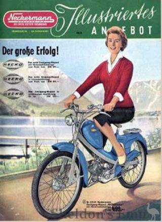 Marketed by Neckermann-Versand KG from 1954 to 1960, the Necko used JLO engines and came in three versions, the 100, the 200 and the Luxe. These were built by Geier-Werke.