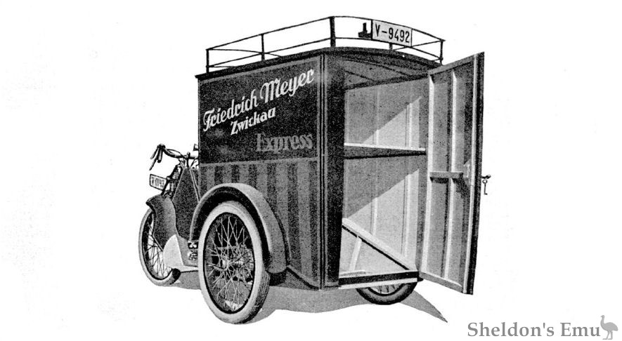 At the Leipzig Technical Fair of 1926 a three-wheel delivery van was introduced in order to reach a larger group of customers. The Per-Motorrad - with a pressed sheet steel frame - was adapted for the purpose. The delivery three-wheelers were equipped with a 308 cc two-stroke engine. Not many can have been built as that same year production came to a halt.