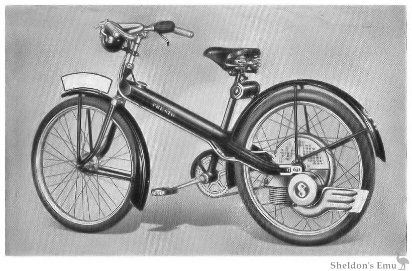 Immediately prior to WWII they also built the Presto Saxonette with a single frame tube which served as the tank, the cradle for the front forks and the base for the support of the seat. It was powered by a 50cc Fichtel & Sachs engine built into the rear wheel.
