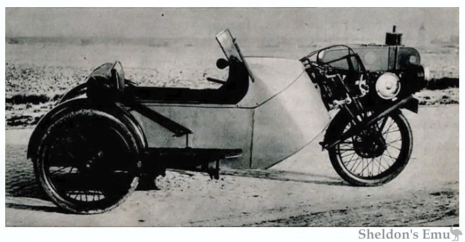 The machine was a tricycle with a single wheel in the front driven by a 200cc Rinne engine mounted above it. It seated two, and weighed 200 kg.