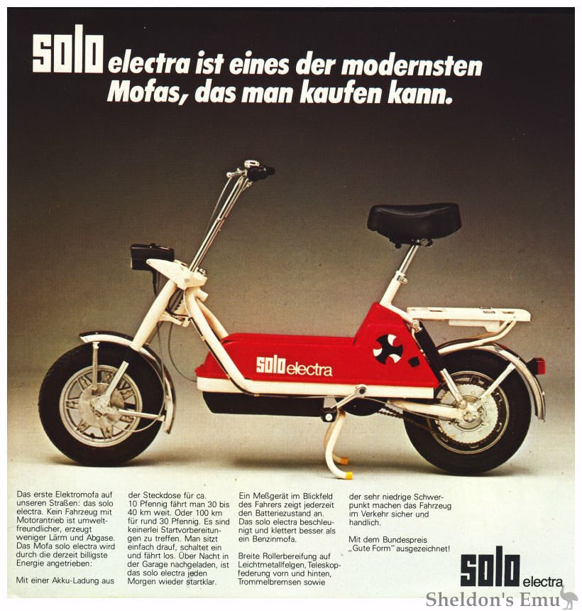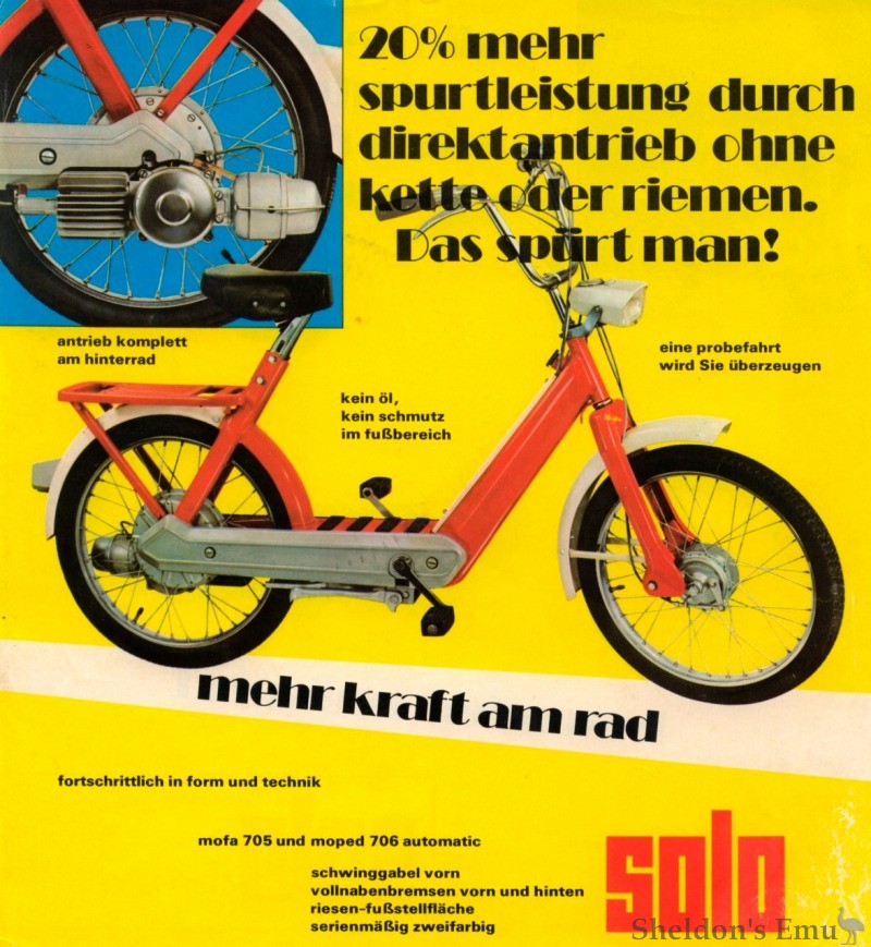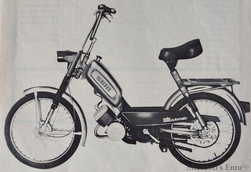 Their first moped appeared in 1971, the water-cooled Solo with 10mm Bing carburettor. The engine cylinder had a jacket containing coolant, but no radiator or water pump. A "mini-bike" Type 726 arrived in 1975, using the same water-jacket 50cc engine. A rather amusing account of this model may be found at icenicam.org.uk - "Solo's wavering VDO speedo did manage to indicate a surprisingly reasonable approximation of actual speed."