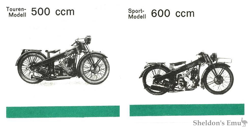 The marque's name was then changed to Spiegler. The motorcycles had pressed-metal frames and included a model with a 350cc four-stroke single of their own production with rather unusual inlet and exhaust tracts. Other machines used engines from JAP, MAG and sometimes Blackburne in capacities of 250cc to 500cc. There is also a report of the use of 350 and 500 cc Küchen engines.