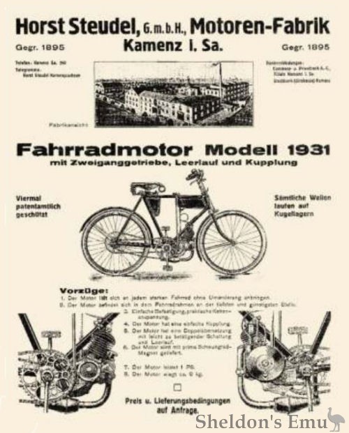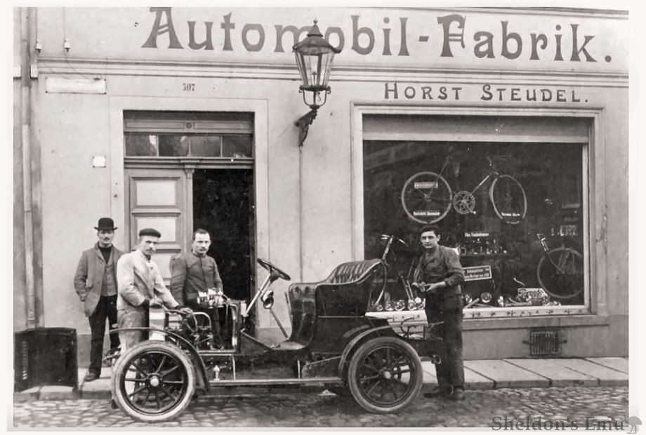 Founded in 1895 by Horst Steudel, it became quite a large firm, their main focus being engines of up to 32 cylinders which were supplied to many other manufacturers. They produced a V-4 two-stroke engine designed for heavy motorcycles which was adopted by DKW for their P25 in 1929, and this engine subsequently powered many thousands of DKW light cars until 1940.