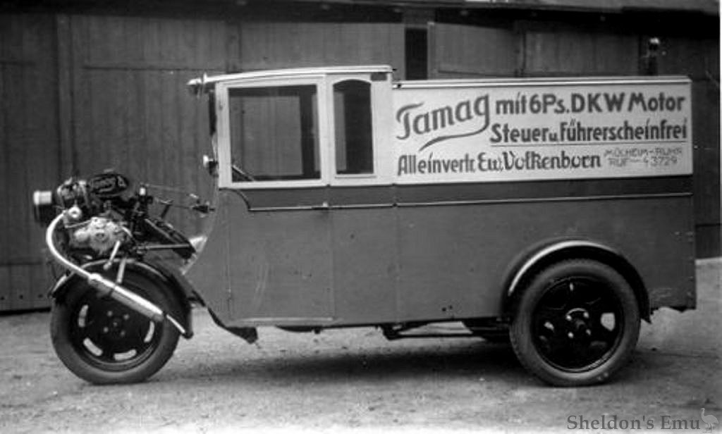 Displayed at the Berlin auto show of 1933 was a Lastendreiräder (cargo tricycle) with a 750kg payload powered by 200cc two-stroke engines from JLO and DKW. Other models of up to 600cc were constructed, some with water-cooled engines, and large trailers could be fitted to some models. Most had the engine mounted above the front wheel.