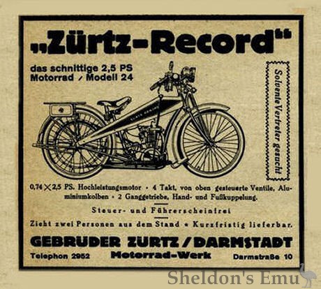 Manufactured by Motorradwerk Gebrüder Zürtz and later Hessische Motorfahrzeugindustrie (Zürtz & Hartmann) of Darmstadt. 1922-c1926