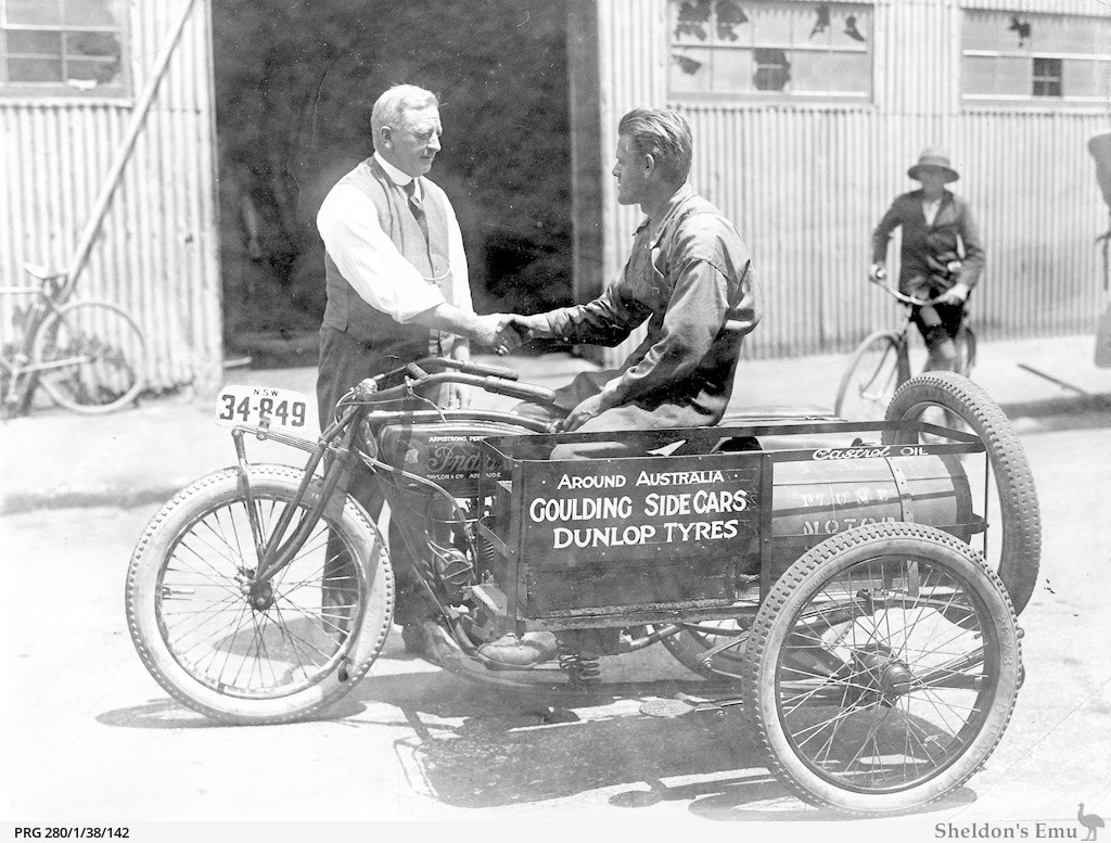 J. N. Boberg of New South Wales arrived in Adelaide on 2 January 1923 having completed the first stage of a journey around Australia on a Dunlop tyred Indian Scout motorcycle. He had left Sydney on 9 December 1922 and was intending to ride to Perth via Port Augusta. The attempt came to an end in April 1923 when some distance beyond Onslow, Western Australia, Boberg ran into a telegraph pole. Advertisements on the sidecar include three for Goulding sidecars, Dunlop tyres, and Castrol oil.