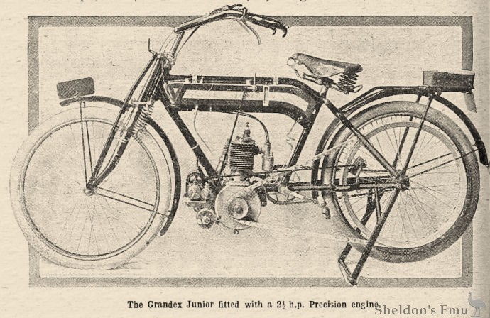 WE had a recent opportunity of carefully examining the latest pattern 2½ h.p. Grandex motor cycle at the showrooms of the Grandex Cycle Co., 28, Gray's Inn Road, W.C. The motive pcwer is a 2½ h.p. Precision engine, m.o.v., dimensions 70 by 76 mm. The frame is somewhat out of the common as regards design, as the top tube is curved and the tube below it is brought exactly parallel with the above, and the tank is made to fit in between the two. The petrol pipe union is situated at the lowest portion of the tank so that the last drop may be used up. The engine is supplied with gas by means of a Brown and Barlow handle-bar controlled carburetter, while the ignition is by the lightweight Bosch magneto. Druid forks are supplied, as also are a good stand and luggage-carrier. Points of convenience are well studied, as the machine is supplied with rubber footrests, petrol gauge, petrol drain tap, and silencer cut-out. The belt rim brake is controlled by a pedal, and its shoe acts on the rear belt rim. The machine is of pleasing appearance, and has the advantage of being a true lightweight, the weight being, we are assured, only about 105 lbs.