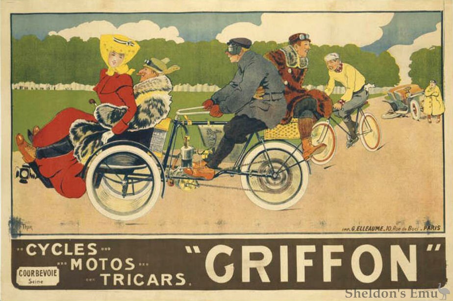 Established in 1898 by Eugène Peugeot, the Griffon Bicycle Company built their first motorcycles in 1902 using one of their bicycle models as a basis to which they fitted a Zédel engine. Development was rapid, and the following year they presented 10 different models at the Paris Show. Racing success followed, and in 1904 one of their machines achieved the then astonishing speed of 110 km/h (65 mph). By this stage factory team riders and privateers on Griffon machines dominated competition.