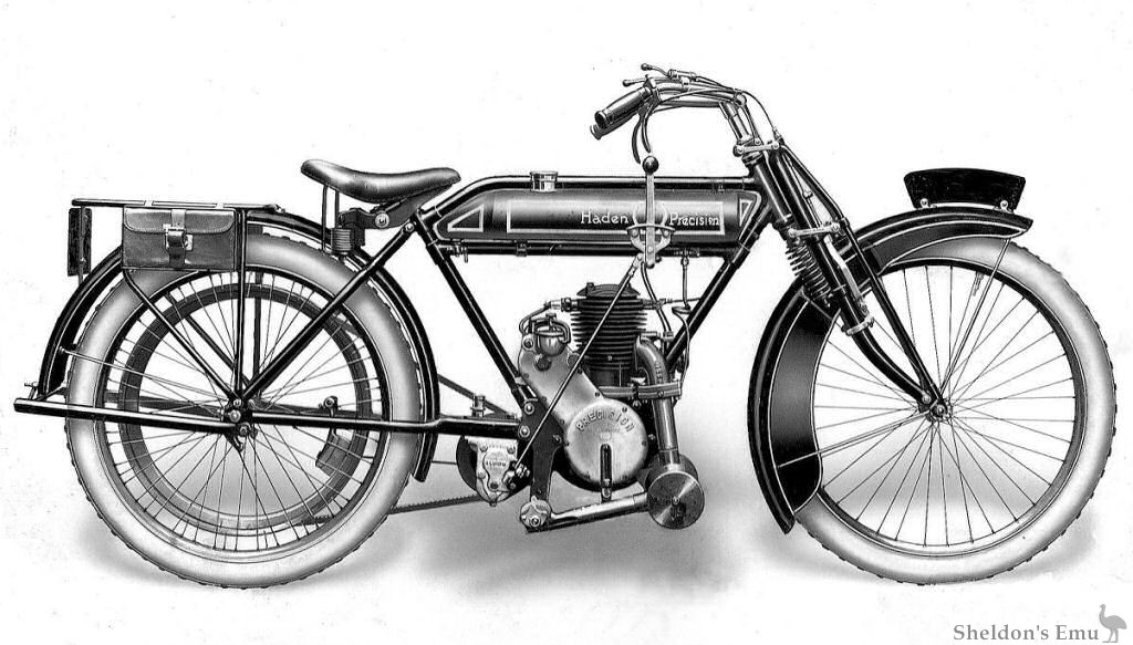 This motorcycle was constructed on conventional lines by A. H. Haden who was also responsible for the New Comet machines. The Haden was fitted with a 349cc Precision two-stroke engine with either two-speed chain-cum-belt or single- speed direct-belt transmission. It could also be fitted with any carburettor that the purchaser specified.