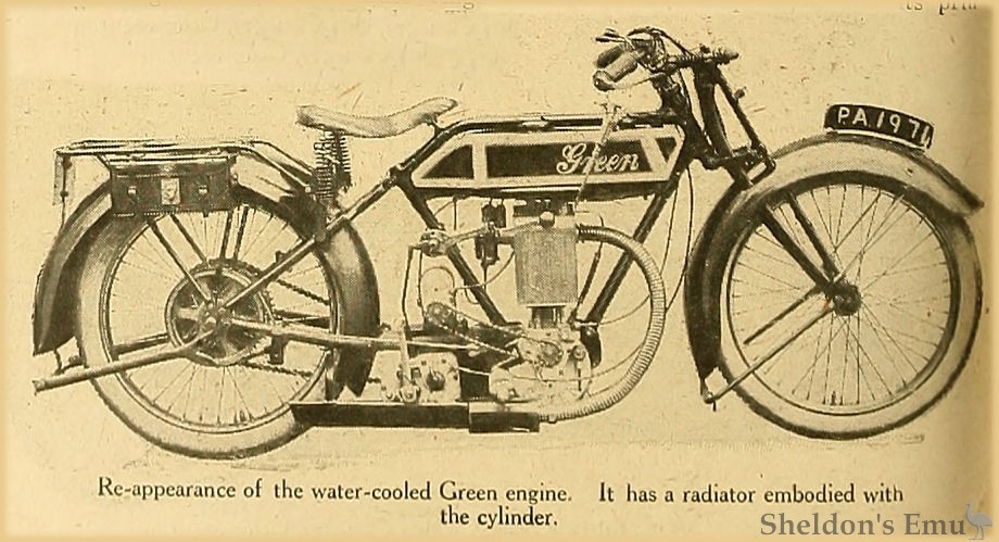 1921 The Green motorcycle appeared once more in the form of a 3½ hp water-cooled machine in its pre-war form. This was probably for stock clearance purposes.