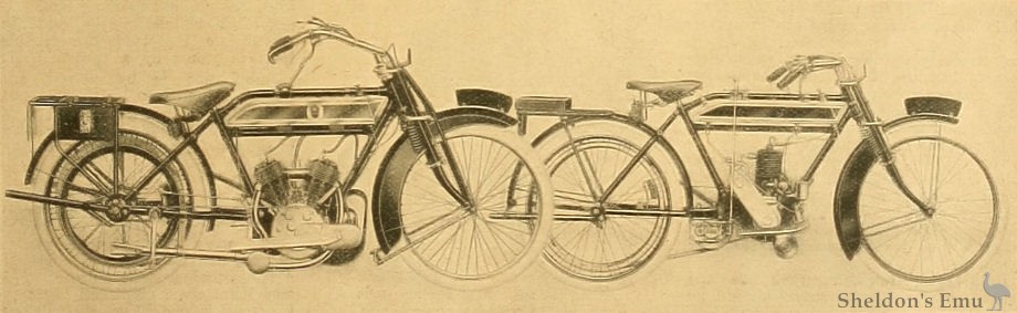Among the long list of remaining models to suit all tastes the big twin may be taken as a worthy representative. It is designed to suit the 6-8 h.p. J. A. P. or Precision engines, and is built throughout to withstand the heavy strains of sidecar work on bad roads. The mudguarding and fittings are of the first order, and the complete machine strikes a high note in motor cycle construction.