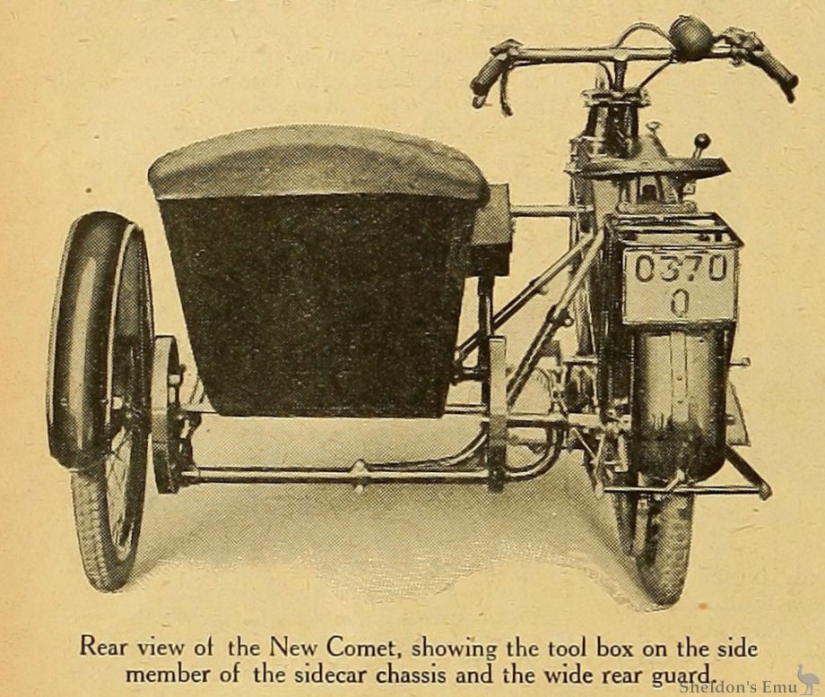 It will be recalled that the Climax engined New Comet has several sidecar records to its credit, which proves the power and reliability of the engine, one of the main features of which is the fact that, unlike the majority of two-strokes, inside flywheels are fitted. This accounts for the absence of "ring," so noticeable with most outside flywheel engines. Smooth running and silence are good features of the little outfit, while the finish of the outfit is in black enamel relieved with gold lines, the tank being decorated accordingly. The primary driving chain is enclosed in a polished aluminium case, which also enhances the appearance, and at 87 guineas complete the proposition is quite attractive.