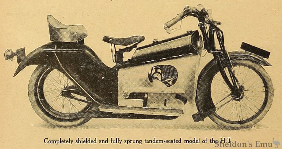 Probably the old and fuller name of the H.T. - the Hagg Tandem - better describes this model, which is a two-seated two-wheeler designed to overcome the main objections to pillion riding. The extra passenger has a comfortable seat, well forward, and is able to place his feet on the rear end of the main footboards. It is claimed that the usefulness of the H.T. as a solo mount is not in any way diminished.