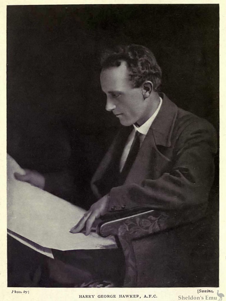 "Hawker's one ambition was to get more from an internal combustion engine of given size than anyone else had succeeded in getting, and his perpetual success became a byword. ... It was in this particular that Hawker shone most brilliantly, and never an engine passed through his hands but it showed an increased power capacity of from 20 per cent, to 100 per cent, when he had finished with it. The same applied to his work in aeroplane and motor-car design. He began where others had left off, and carried what they considered the final stage of development to a point that they had either not dreamed of or had definitely decided to be impossible of achievement. ... No one but Hawker could have avoided death at the end of that skid. It took place on a car which, originally capable of some sixty miles an hour, regularly accomplished, when he had finished with it, over a hundred."
