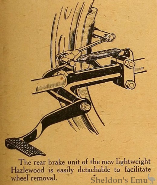 All Hazlewood models are fitted with wide Druid type forks, and mudguarding has received very special attention, being most efficient. The existing 6 h.p. model, with chain and belt drive, and the 8 h.p. type, with all chain drive, will be retained, but the latter will in future be fitted with an internal expanding rear brake.