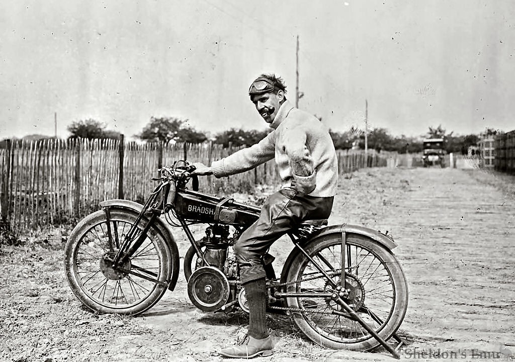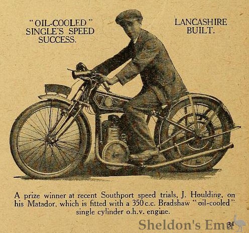 Bradshaw engines were used throughout the lifespan of the marque, and the first machines were fitted with the 349cc oil-cooled ohv version. Other standard fittings were all-chain drive and a three-speed gearbox. Braking was via both brakes acting independently on the rear wheel.