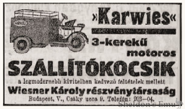 Manufactured by Károly Wiesner of 9 Csåky Street, Budapest, in 1927 and 1928. Only a handful of the Karwies 3-kerekü motoros were produced.