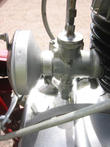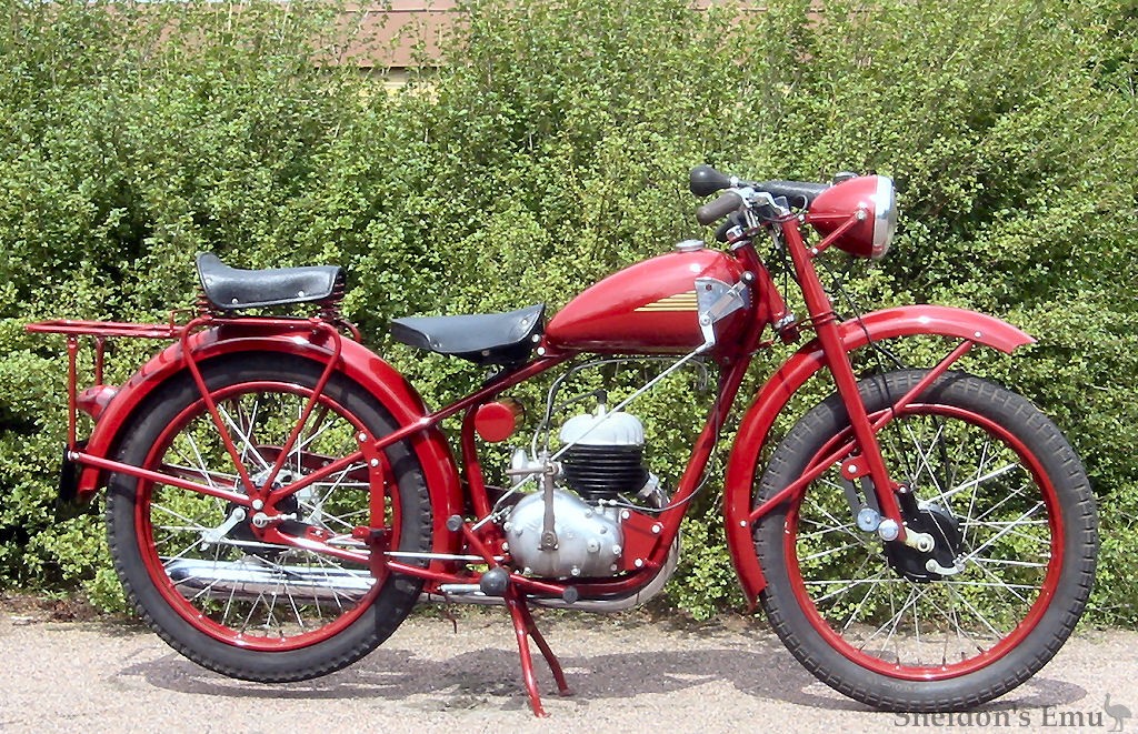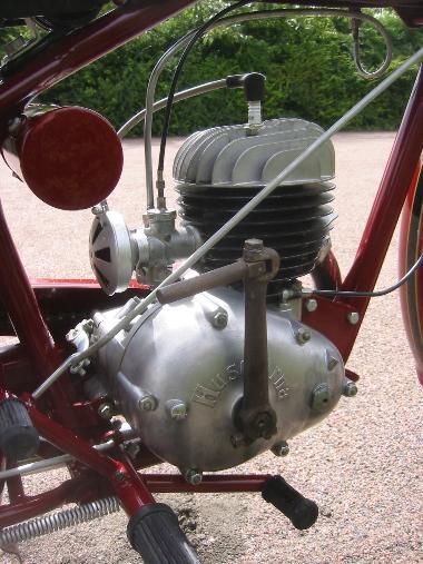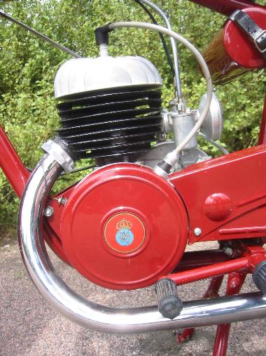 The 120cc two stroke engine with flywheel magneto and generator, originating from the 118cc engine introduced in 1946, shows a close relation to the pre-war 98cc. It has a forward kick start and a integrated engine-gearbox, and is fitted with an Amal carburettor.
