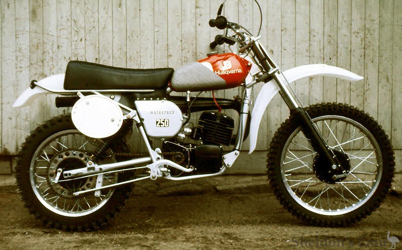 I had thought to make a completely new frame over the winter, based on the new GP frame but using the Canadian Boulger rear suspension, and curing the crankcase problems by welding-up a steel one (yes!) using the new, smaller mag-clutch, but Bror Jauren, HVA Economic and Sales Director told me the GP 250 was now sorted, he would like me to consider buying one. So I never finished the 400, sold it off as was. Ratty, but much better than when I bought it. Why the personal touch? Jauren liked me (rarely met Helmin, he wasn't a sociable chappie and was seldom at the races, I've only really spoken to him once, when I tested the auto-250 army bike for an Aussie mag. I spent most of the time with Urban Larsson, the civil-engineer/designer who did most of the actual sharp pencil-on-paper work) as in '75 he had met Princess Anne at the horse-jumping in Gothenburg, where we were part of Scandinavia's top motorcycle show, and, as I spoke good English, I had taken Harvey Smith, John Whittaker and Mark Philips (Anne was actually on the way over in a private plane at this time, so I didn't actually meet her - shame, nice ass! She was keen on bikes, it seemed, but they wouldn't let her ride one) under my wing when he was out checking the bikes, giving a sales-schpeel - that had all the journalists desperately listening-in for some free copy! - that had knocked Jauren's socks off.