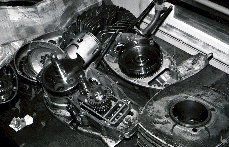 I realised my trusty 4-speed 250 wasn't competitive against the latest bikes and tried a 360 4-speed in my 250, the 500 class not being so hot a class and I thought the suspension wouldn't matter so much (you have pics of the stripped ex-works 360, which then underwent a thorough development and cosmetic program before being sold-off after 6 or so races (the broken fin never got repaired) as it was too dangerous to race as it needed a new gearbox every 3 races, it ripped them apart. It was the fastest engine I've ever encountered, a viscious, hard-hitting powerband, never confirmed but it must have had near 50 bhp).