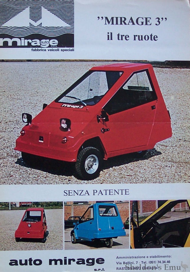 The firm initially built dune buggies before swapping to three-wheeled microcars in 1976. The first of these, the Mirage 3, was powered by a Franco Morini 50cc engine which drove the single rear wheel. It had a fibreglass body shell and seats for 2 people - the passenger needed to be quite petite.