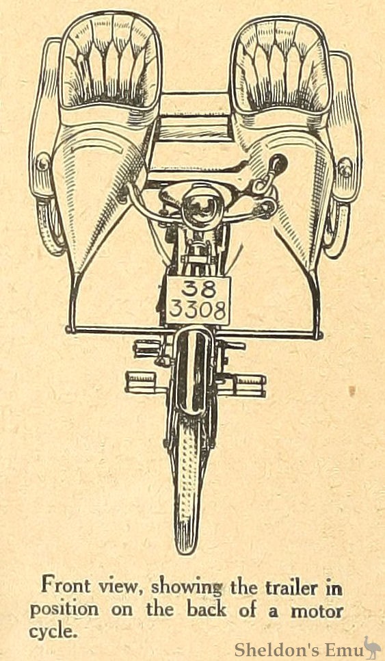 The inventor states that the combination can take corners without the slightest fear of upsetting either when fully loaded, one only occupied or both empty, and that every ounce of motor power is used for hauling the trailers, and practically no strain is imposed on the motor cycle frame.