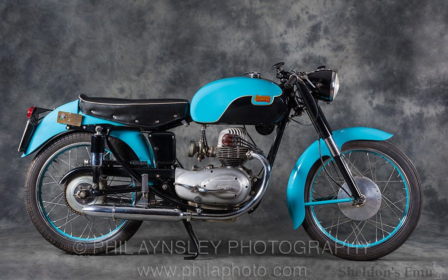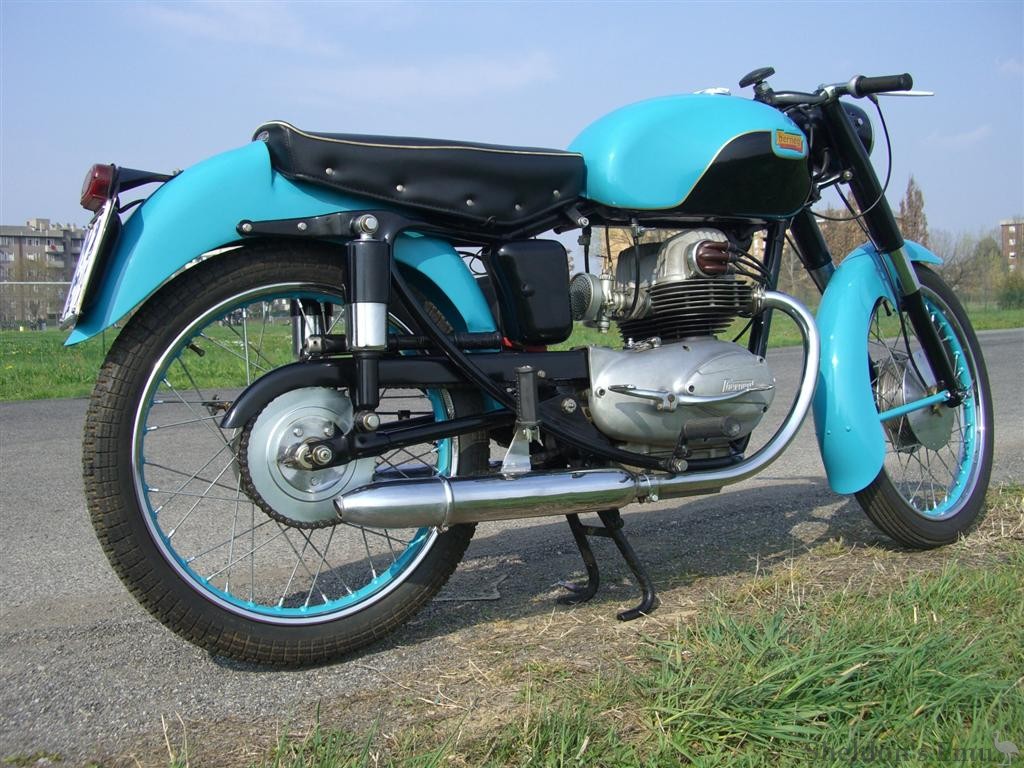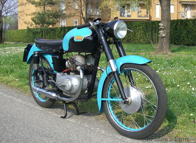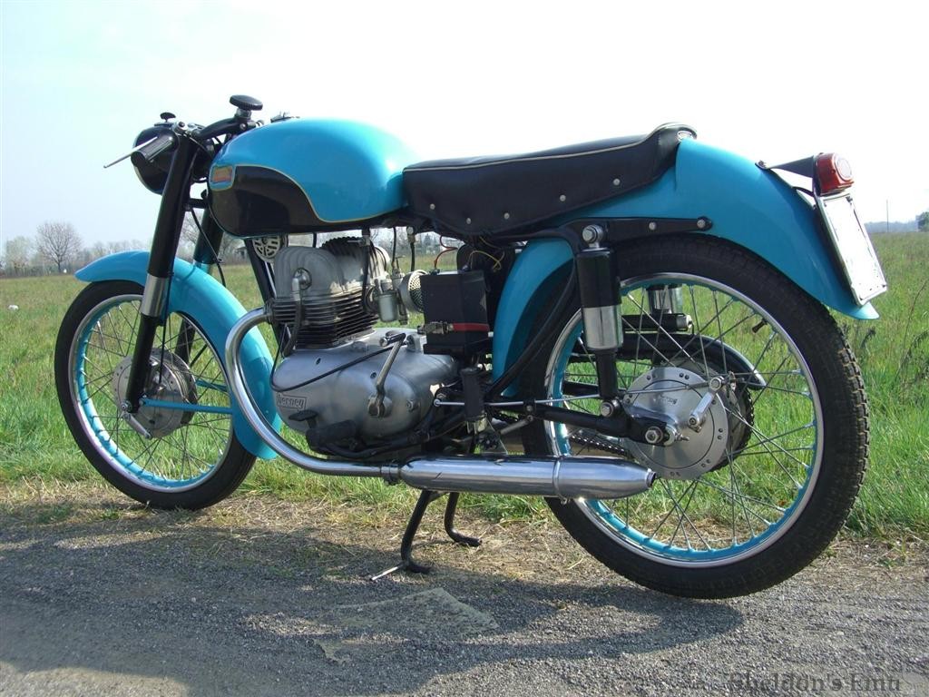 Designed by Alfonso Drusiani the first model, the Iridea, was displayed at the Milan Show in 1955. The engine is a an OHC vertical twin of 160cc with chain-driven cam, and has alloy heads on a cast iron barrel.