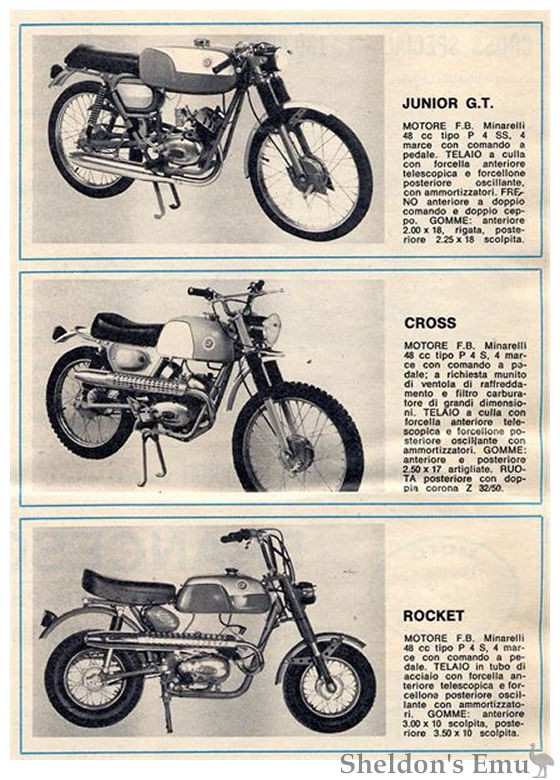 1969 models included 48cc Minarelli Junior GT, Cross and Rocket, the latter with small wheels - 300x10 front and 350x10 rear. There was also a 6-speed sports machine, the Ringo.