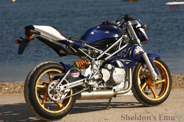 The CR&S Duu has an American S & S V-twin and is every inch the custom special. It churns out over 90 h.p.