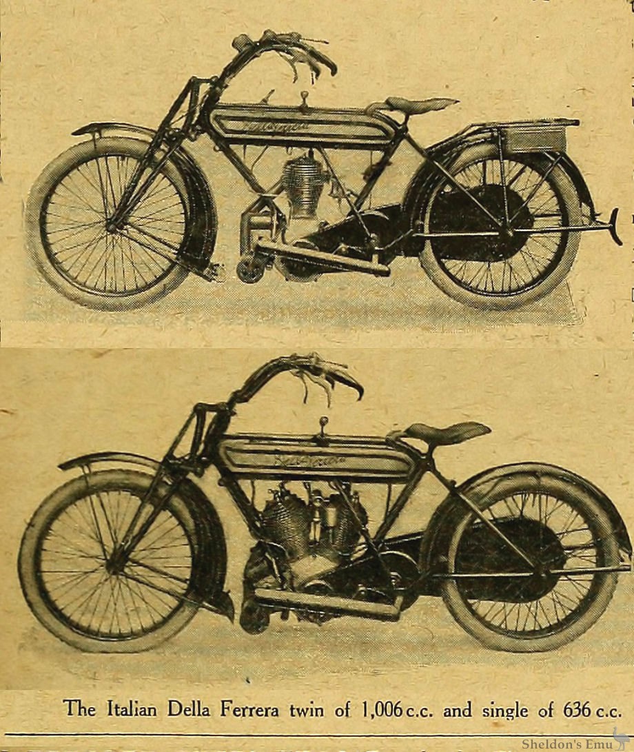 The single-cylinder Della Ferrera has a bore and stroke of 90 and 100 mm. respectively while the cylinders of the twin are 80 x 100 mm. bore and stroke. The capacity of the former is 536 c.c. and 1,005 c.c. in case of the latter.