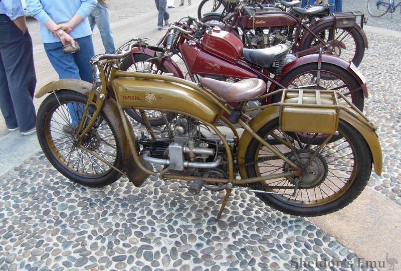 Founded in Turin by the brothers Eugenio and Fontana*, the firm used their own horizontally opposed twins of 500 and 575cc with three-speed gearbox and chain drive, with the engine mounted longitudinally. It bears a distinct similarity to the Bradshaw twin which first appeared in 1912.
