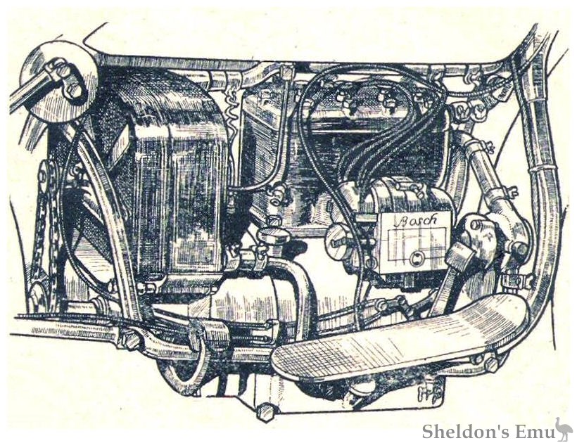Motorcycle production resumed after the war and Garabello, now with his son Giuseppe, designed an inline water-cooled four-cylinder machine with cardan transmission which was revealed in 1922 after three years of trials. This was the first four-cylinder Italian motorcycle. Of interest is the route which the engine coolant travels - a serpentine mass of tubing within a pre-cooler located in front of the fuel tank delivers coolant to a second fan-cooled radiator behind the engine.