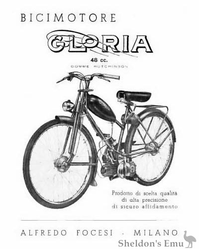 In 1949 the company built the Gloria 3M moped with three-speed gearbox and swing-arm suspension. The engine was mounted on the swinging arm, scooter style. These were available in Normale, Lusso and Sport versions. For 1951, they advertised the 48cc Bicimotore Gloria, a moped with the engine mounted at the base of the frame triangle, centred between the pedals.