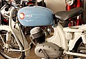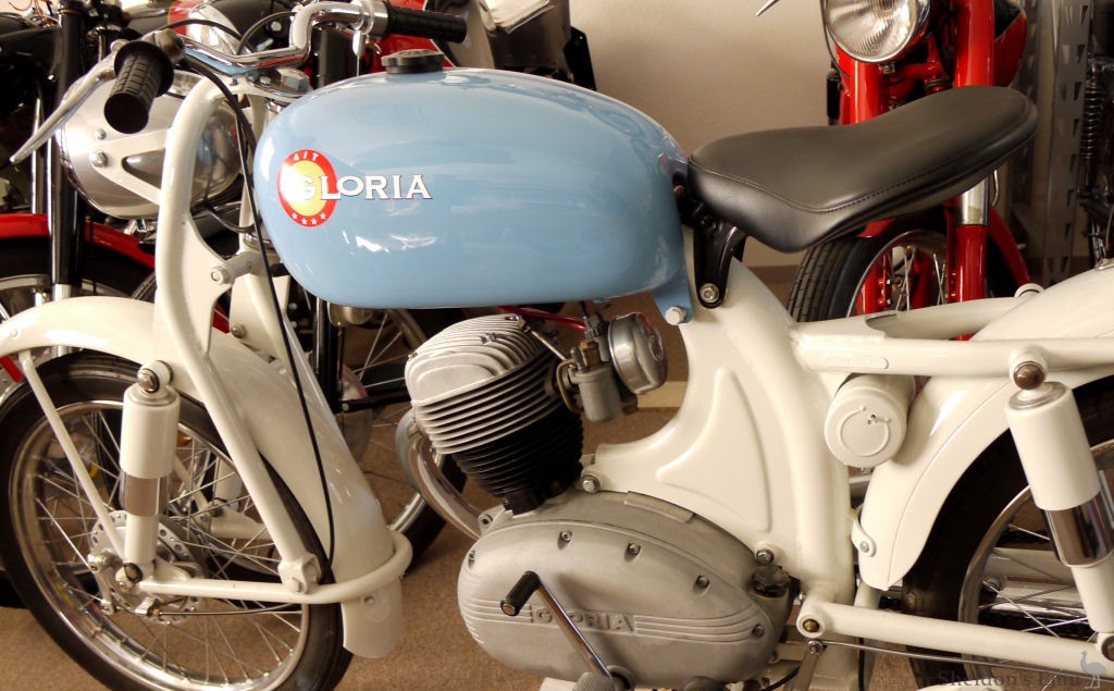 In 1953, added to the range was a lightweight motorcycle, the Gloria 100, with an OHV 98cc engine and three-speed gearbox mounted in a pressed metal frame, in Turismo and Sport models.[1] These were fitted with a dual seat, deeply valanced guards and a headlight nacelle blending into the tank.