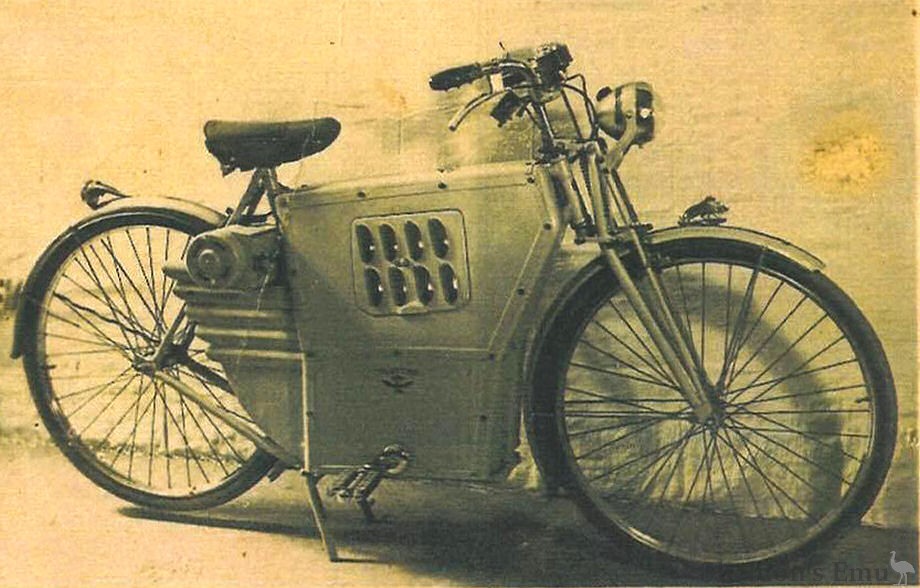 A motoleggera built by Otello Albanese using a 175cc engine which appears to have been a slightly modified Moser, with two exhaust valves in the head and a side valve inlet.