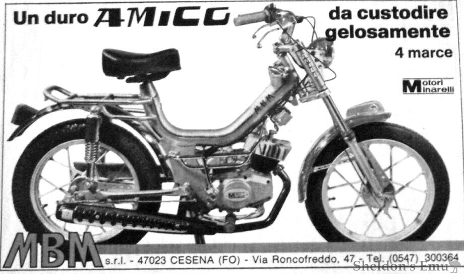 Other models include MBM Amico 50 (1976-77), built in the "turbone" fashion, the similar Pony of 1972 with a 49cc Minarelli V1 engine, the Chico Bimbo minibike (S5K engine, 8 & 9in wheels), and 50cc offroad machines named Combat.
