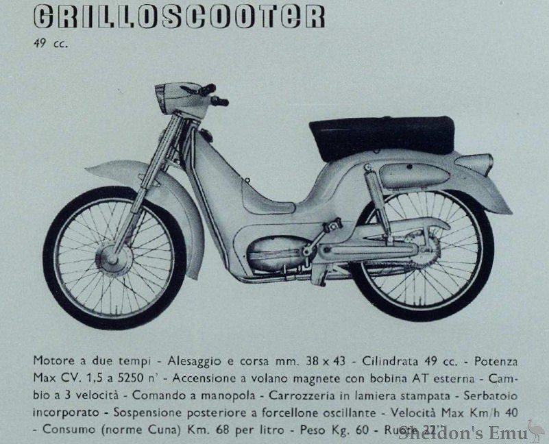 Models included the Grillo 49cc (1959-1962) Libeccio 125 (1957), Holiday 50 and Carnaby 50 (mid 1970s), Brixia 6 SS 49cc (70s) and Cross 50 (1973).