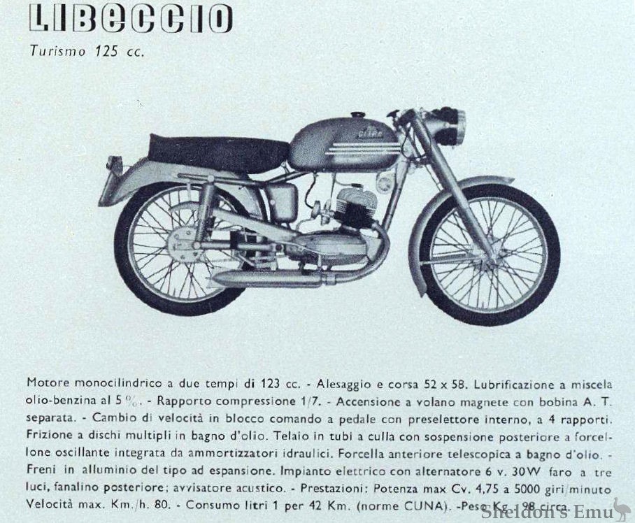 1955 models: Libeccio 125 & Libeccio Sport 125 2T, Scirocco 125cc 2T, Turbine 160cc 4T, Turbine GT 175cc 4T, all with swingarm rear suspension and telescopic forks. Chassis and bodywork very similar.