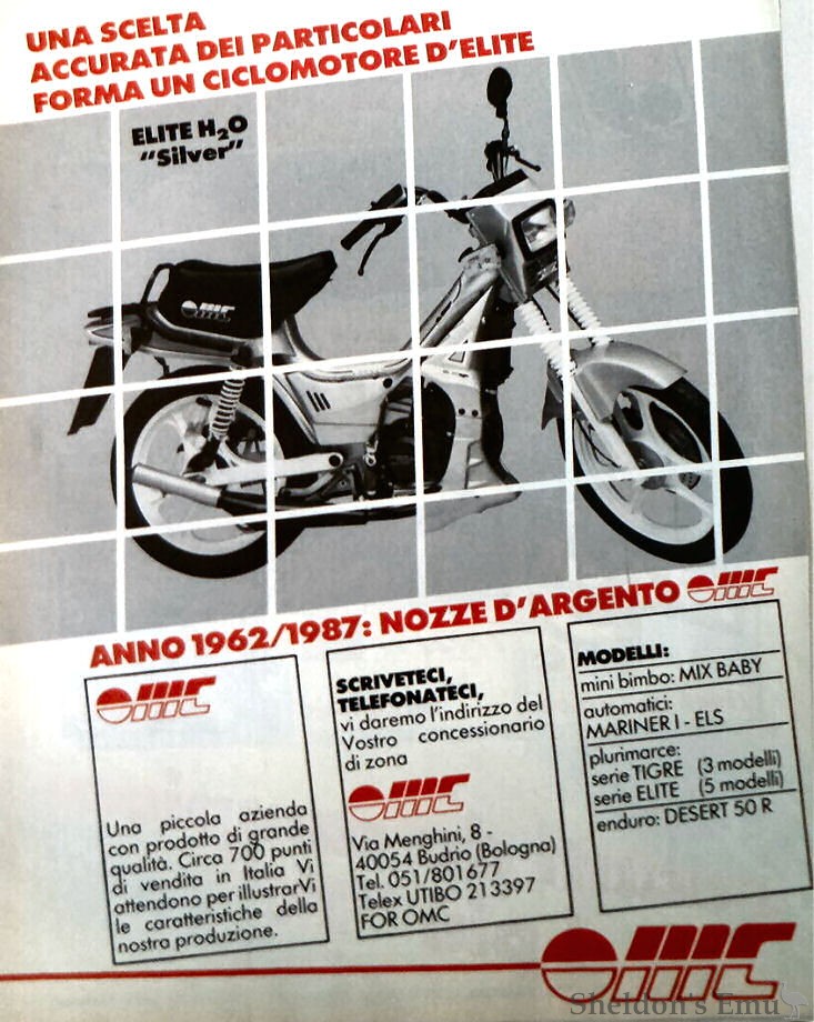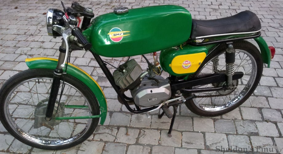 An example pictured at mondo50cc.forumfree.it showed a lightweight two-stroke of probably 50cc sans pedale with small mag wheels. Another at subito.it is described as "...tubone prototype college Cambridge oemmeci o. M. C. Omc minarelli 4-speed from 1978" has conventional wire wheels, no pedals, vertical two-stroke engine, telescopic forks and swing-arm rear.