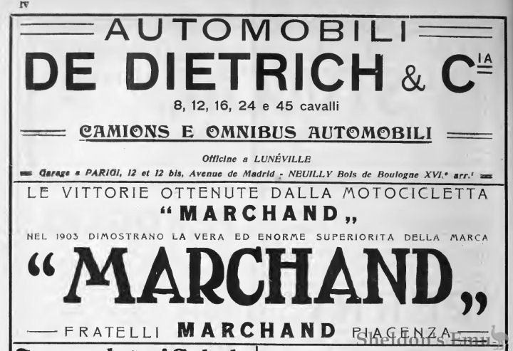The loss of Merosi was a severe blow for Marchand. In January 1907 the Piacenza company was absorbed by Dufaux Freres of Geneva, builders of Motosacoche, becoming Marchand-Dufaux.
