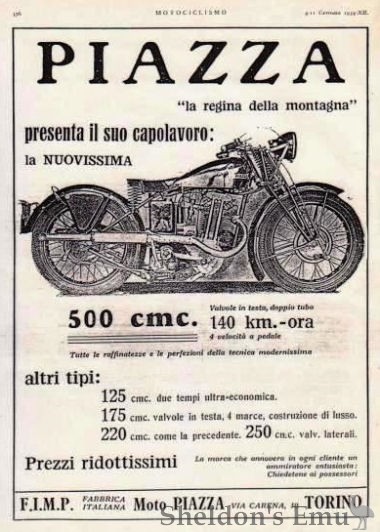 Italian engineer Antonio Piazza of Torino built motorcycles from 1924 to 1926, and then concentrated on the development of engines for other motorcycle firms of which, at the time, there were many.