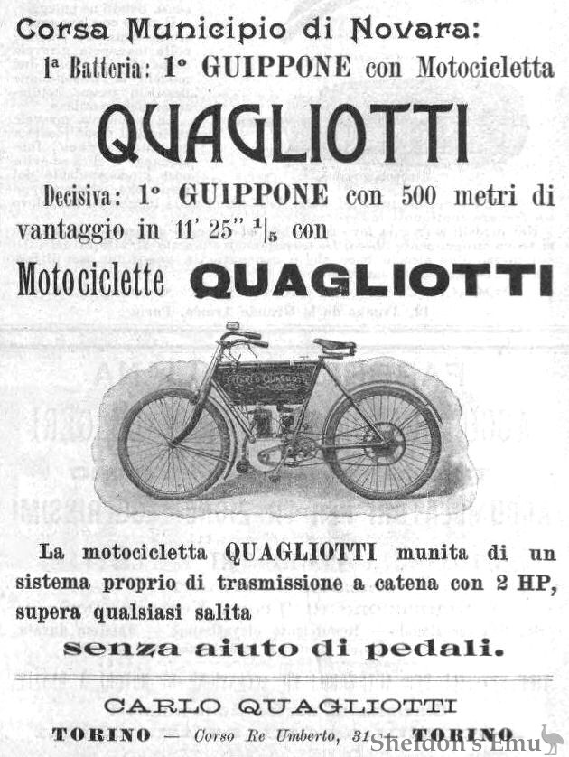 Founded by Carlo Quagliotti in Turin, the company was one of the most important manufacturers in the early twentieth century, producing motorcycles with Peugeot 2 CV single cylinder and larger V-twin engines from 1902 to 1907.