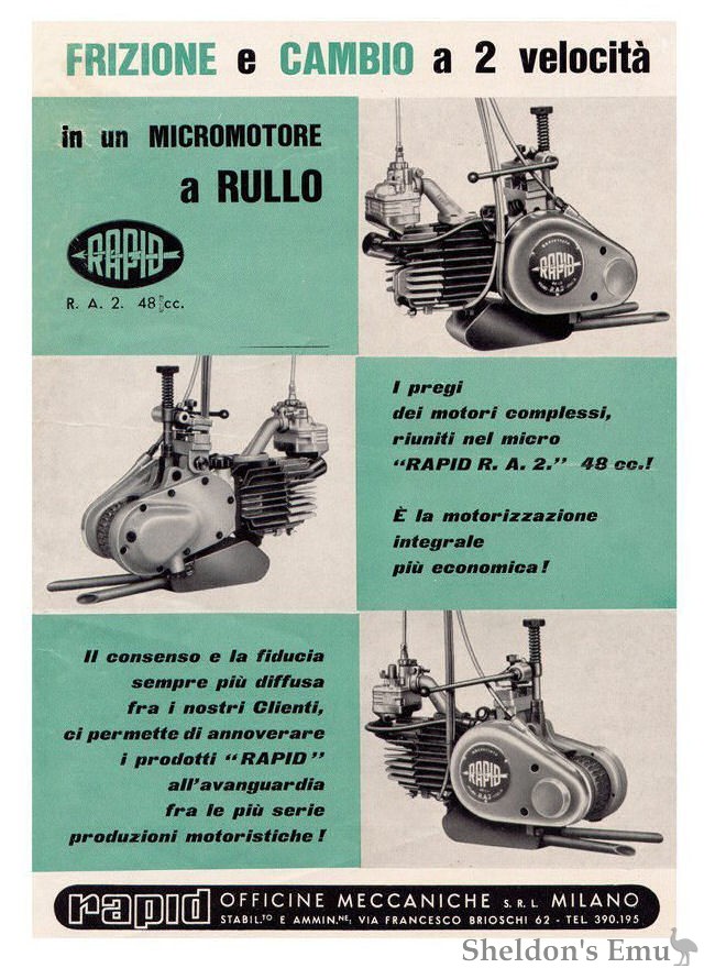 Auxiliary engine for bicycles made by Officine Meccaniche Rapid headquartered at Via Brioschi, Milano. The 48cc engine with friction roller drive was equipped, unusually for the time, with a multi-plate clutch in an oil bath.