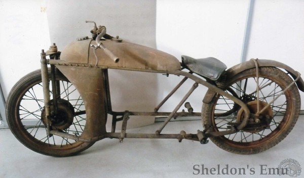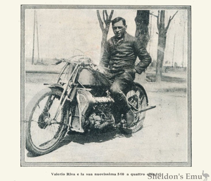 A supercharged four-cylinder 500cc engine with dual overhead camshaft and water cooling built by Valerio Riva made a brief appearance at the 1928 Monza Grand Prix. It exploded on the first lap. Later another 500cc 4 cylinder machine appeared with front suspension which is understood have been supplied by George Roy of Majestic fame. An image of the 30s machine in the Milani book is titled 1930, but a forum post says the rear hub is by Baruffaldi which was not made until 1933. The machine is also briefly mentioned in Le mythe des 4 Cilindri by Claude Reynaud.