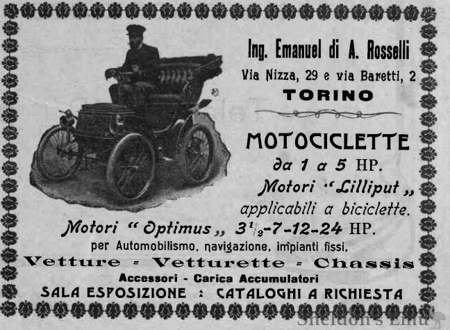 Lilliput motors "aplicablili a biciclette" were available separately, as were Optimus engines for boats, cars and vetturette.