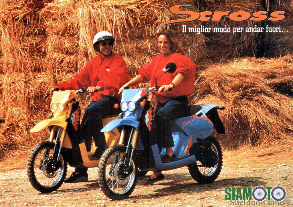 Several scooter models were listed in the 90s, all with 50cc Minarelli engines apart from the Scross, an offroad scooter fitted with mx tyres and suspension. The Scross was powered by a two-stroke reed valve 49cc Franco Morini engine.