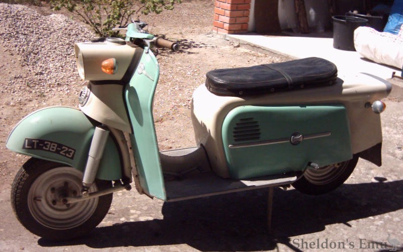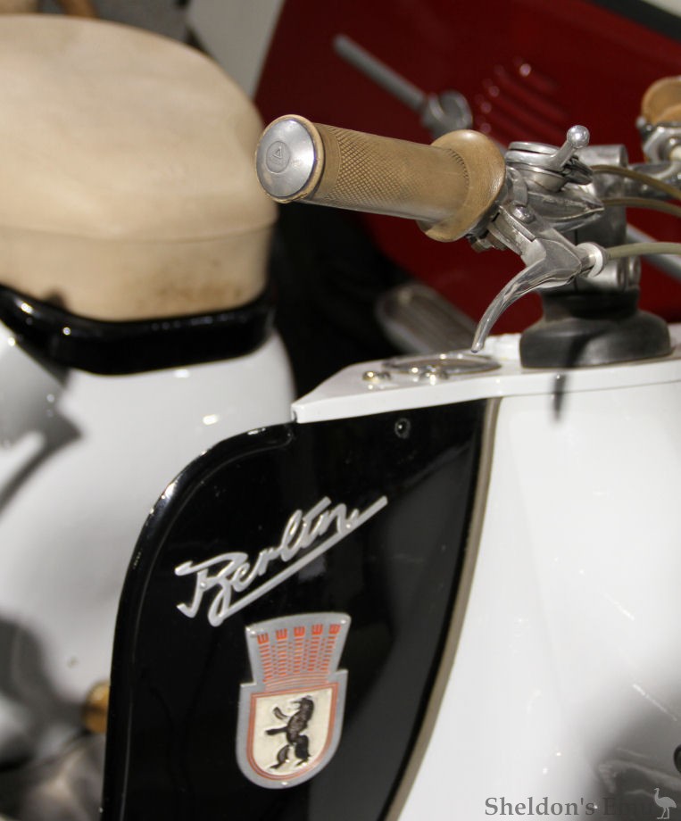 The Berlin SR 59 Stadtroller (city scooter) was, in appearance and styling, almost identical to the Wiesel but was fitted with a more powerful 145cc MZ engine allowing a top speed of 82kph. It had a 4 speed gearbox and rider comfort was improved by the addition of a rear shock absorber and sprung saddles.